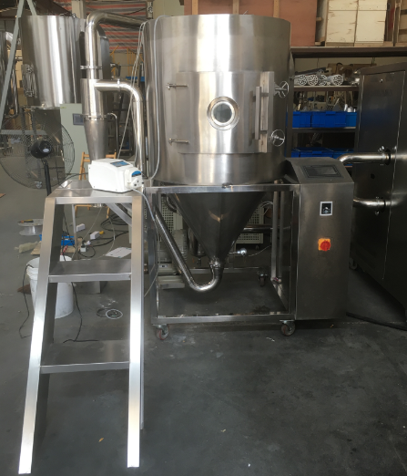 制備出真正的圓球狀實心微球顆粒,首選實驗可用上海歐蒙生產(chǎn)的OM-5000型實驗型噴霧干燥機(jī)。實驗型噴霧干燥機(jī)系統(tǒng)工作流程如圖所示。該系統(tǒng)的工作原理是空氣經(jīng)過電加熱以后,再通過高溫過濾器,以保證進(jìn)人塔體的空氣是潔凈熱空氣,然后通過干燥室頂部的熱風(fēng)分配器,通過熱風(fēng)分配器的熱空氣均勻地進(jìn)人干燥室內(nèi)并呈螺旋狀轉(zhuǎn)動,同時將料液送至離心噴霧頭。鋁礬土料漿被高速旋轉(zhuǎn)的噴霧頭噴射成球形霧滴,水分迅速在霧滴表面蒸發(fā),在極短的時間內(nèi),霧滴干燥收縮成為微球坯體。較粗的微球顆粒由干燥室底部的收集桶收集,較細(xì)的微球顆粒通過設(shè)在錐底的管道流到旋風(fēng)分離器,并由套在旋風(fēng)分離器底部的收集桶收集。廢氣通過除塵器排出。