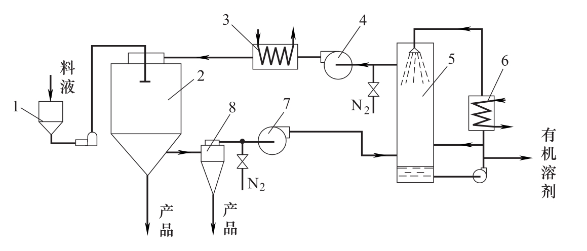 閉路循環(huán)噴霧干燥機(jī)系統(tǒng),是基于干燥介質(zhì)為惰性氣體(如N2氣等)的再循環(huán)和再利用。當(dāng)然,特殊情況下也可以用空氣,如空氣-四氯化碳系統(tǒng)。干燥系統(tǒng)部件間的連接處,要保證氣密性密封,干燥室在低壓(約200mmH2O左右,即0.196kPa)下操作。其流程如圖所示。